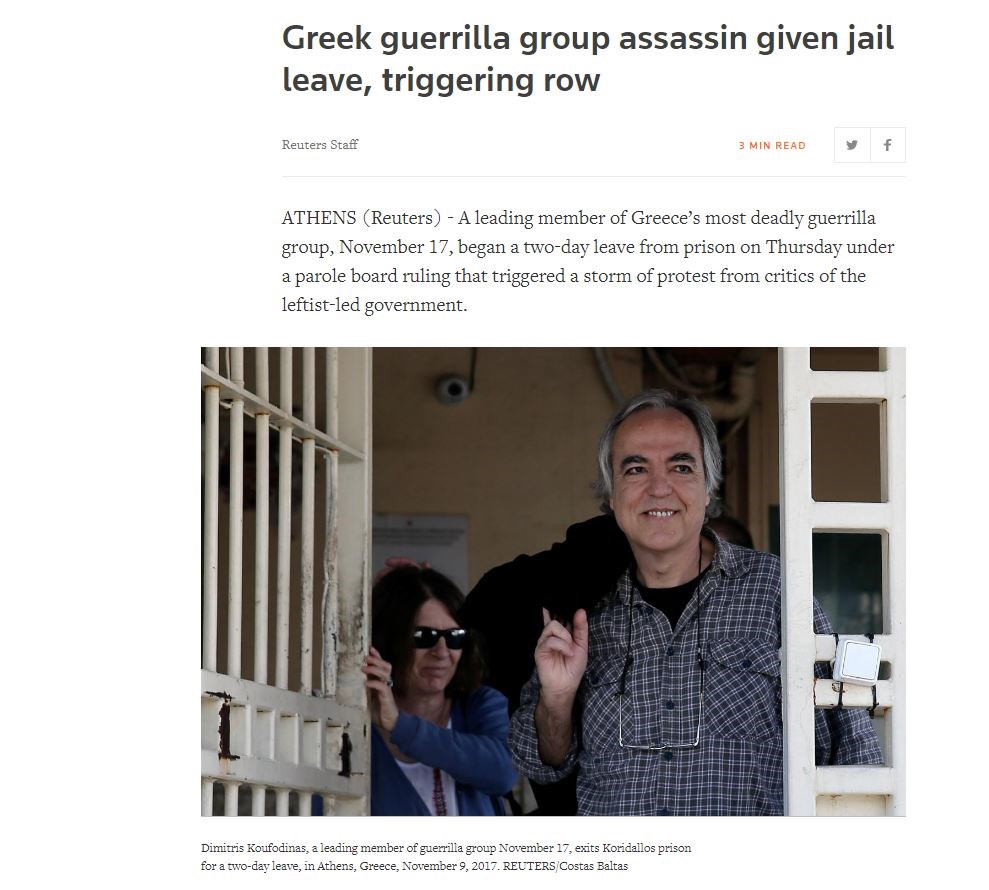 «Ένα ηγετικό μέλος της πιο θανατηφόρας τρομοκρατικής οργάνωσης στην Ελλάδα, την «17 Νοέμβρη», ξεκίνησε σήμερα την διήμερη άδειά του από την φυλακή μετά από σχετική απόφαση του Συμβουλίου των Φυλακών. Η απόφαση αυτή προκάλεσε θύελλα αντιδράσεων από επικριτές της αριστερής κυβέρνησης» γράφει το Reuters.