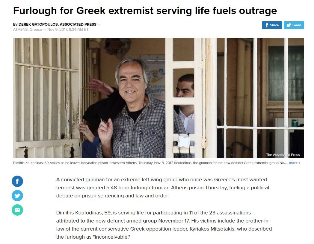 «Ο Δημήτρης Κουφοντίνας εκτίει αρκετές ποινές ισόβιας κάθειρξης για τη συμμετοχή του στην μαρξιστική οργάνωση 17 Νοέμβρη, η οποία δρούσε στην Ελλάδα για σχεδόν τρεις δεκαετίες μέχρι που οι ελληνικές αρχές συνέλαβαν την ηγετική ομάδα το 2002», προσθέτει.
