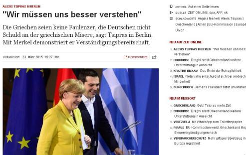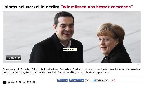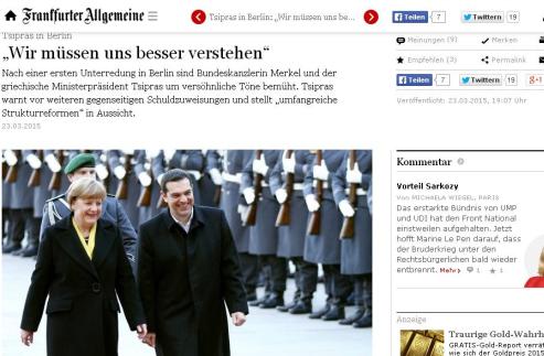 Ιδιαίτερη σημασία δόθηκε στα λόγια της κ. Μέρκελ ότι επιθυμεί μία εύρωστη οικονομικά Ελλάδα, ωστόσο η Welt στάθηκε στη δήλωσή της ότι η Γερμανία δεν μπορεί να δεσμευτεί για παροχή ρευστότητας στην Ελλάδα, καθώς εκπροσωπεί μόνο μία από τις 19 χώρες που συνιστούν την Ευρωζώνη. Πολλά μέσα, ανάμεσά τους και η γνωστή ταμπλόιντ εφημερίδα Bild, αναφέρθηκαν στην προσπάθεια των δύο ηγετών να παραμερίσουν τα στερεότυπα που έχει ο ένας λαός για τον άλλον, τονίζοντας ιδιαίτερα τη φράση του Α. Τσίπρα ότι ούτε οι Έλληνες είναι τεμπέληδες ούτε οι Γερμανοί ευθύνονται για την ελληνική κρίση.