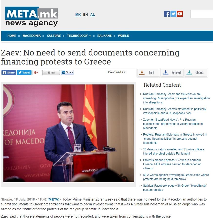 Ο Ζάεφ υποστήριξε ότι οι μαρτυρίες των ανθρώπων που ανέφεραν ότι υπήρξε χρηματοδότηση από Έλληνες επιχειρηματίες, που διάκεινται ευνοϊκά προς τις ρωσικές θέσεις, για την υποκίνηση διαμαρτυριών στα Σκόπια δεν έχουν καταγραφεί και είναι από συνομιλίες με την αστυνομία.