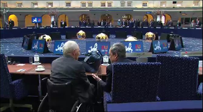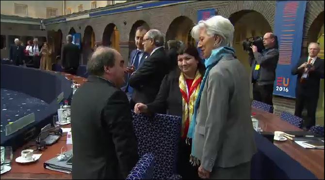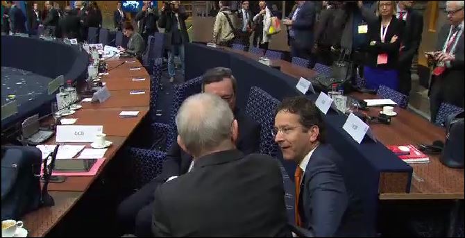 Λίγο πριν ξεκινήσει η συνεδρίαση κορυφαίοι Ευρωπαίοι αξιωματούχοι σχηματίζουν πηγαδάκια και συζητούν μακριά από τα μικρόφωνα. Η κάμερα συνέλαβε τον επικεφαλής της ΕΚΤ, Μάριο Ντράγκι, να μιλάει με τον Γερμανό ΥΠΟΙΚ, Βόλφγκανγκ Σόιμπλε και τον πρόεδρο του Eurogroup, Γερούν Ντάισελμπλουμ, ο οποίος λίγα λεπτά αργότερα αποχώρησε από τη συζήτηση, αλλά και τη διευθύντρια του ΔΝΤ, Κριστίν Λαγκάρντ, να συνομιλεί σε χαλαρή διάθεση με Ευρωπαίους ΥΠΟΙΚ.