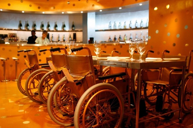 Μοναδικά γεύματα μοριακής κουζίνας προσγέρει το εστιατόριο Aurum στη Σινγκαπούρη, ενώ τα τραπέζια αντί για καρέκλες διαθέτουν αναπηρικά καρότσια.