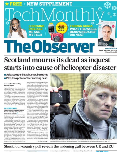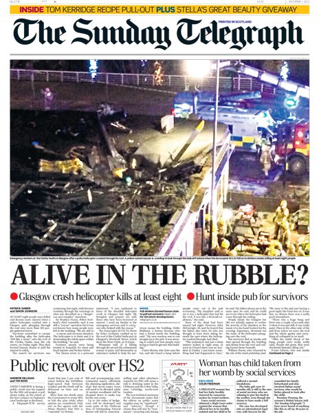 Η τραγωδία με την πτώση του ελικοπτέρου στη Γλασκώβη, που στοίχισε τη ζωή σε 8 άτομα, κυριαρχεί στα πρωτοσέλιδα των βρετανικών εφημερίδων.