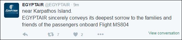 “Η ΕgyptAir εκφράζει τη βαθύτατη λύπη της στις οικογένειες και τους φίλους των επιβατών της πτήσης MS804. Τα μέλη της οικογένειας των επιβατών και του πληρώματος έχουν ήδη ενημερωθεί και εμείς συμπαραστεκόμαστε στον θρήνο τους”, επισημαίνεται σε επόμενο tweet.