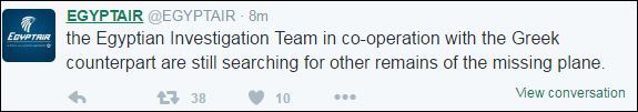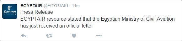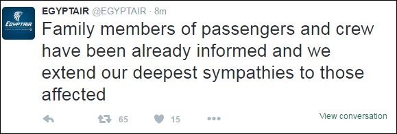 Η ΕgyptAir εκφράζει τη λύπη της στις οικογένειες και τους φίλους των επιβατών του αιγυπτιακού αεροσκάφους, μέσω αναρτήσεών της στην επίσημη σελίδα της αεροπορικής εταιρείας στο Twitter.