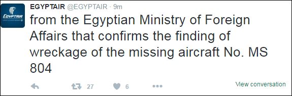 “Πηγή της ΕgyptAir σημειώνει ότι το αιγυπτιακό Υπουργείο Πολιτικής Αεροπορίας μόλις έλαβε επίσημη επιστολή από το αιγυπτιακό υπουργείο Εξωτερικών, που επιβεβαιώνει τον εντοπισμό των συντριμμιών του αεροσκάφους MS 804, κοντά στην Κάρπαθο“, αναφέρεται σε ανάρτηση στη σελίδα της ΕgyptAir.