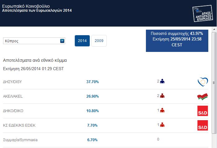 Μετά τα μεσάνυχτα έγινε η επίσημη ανακοίνωση των τελικών αποτελεσμάτων των χθεσινών ευρωεκλογών και η ανακήρυξη των έξι νεοεκλεγέντων ευρωβουλευτών, που καθυστέρησε μέχρι να κλείσουν οι κάλπες στην Ιταλία. Όπως ανακοινώθηκε από την Υπηρεσία Εκλογών, ψήφισε το 43,97% και η αποχή ανήλθε στο χωρίς προηγούμενο επίπεδο του 56,03%.