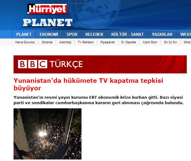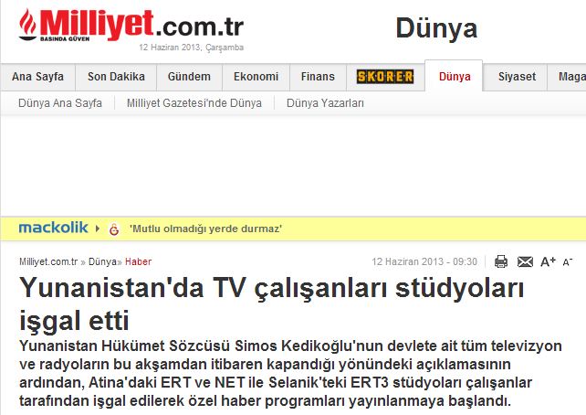 Η Millyet γράφει: “Μετά την ανακοίνωση του κυβερνητικού εκπροσώπου, Σίμου Κεδίκογλου, τα studio της ΕΡΤ και της ΝΕΤ στην Αθήνα καθώς και το studio της ΕΤ3 στη Θεσσαλονίκη καταλήφθηκαν από τους εργαζομένους και “τρέχει” ένα ειδικό τηλεοπτικό πρόγραμμα”.