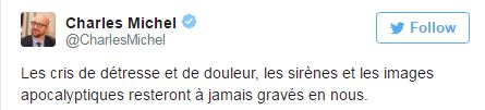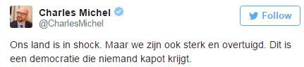 «Η δημοκρατία του Βελγίου δεν θα σπάσει. Η χώρα μας είναι σε κατάσταση σοκ αλλά είμαστε δυνατοί και αισιόδοξοι. Οι κραυγές αγωνίας, οι σειρήνες και οι αποκαλυπτικές εικόνες θα μείνουν για πάντα χαραγμένες στη μνήμη μας» έγραψε ο Σαρλ Μισέλ στον προσωπικό του λογαριασμό στο twitter ανεβάζοντας τις παρακάτω φωτογραφίες: