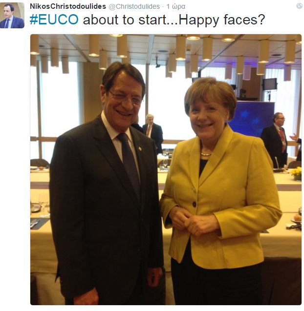 Στη φωτογραφία που ανέβασε στον προσωπικό του λογαριασμό στο twitter ο κυβερνητικός εκπρόσωπος της Κύπρου, Νίκος Χριστοδουλίδης, η Γερμανίδα Καγκελάριος και ο πρόεδρος της Κύπρου ποζάρουν χαμογελαστοί στον φωτογραφικό φακό.