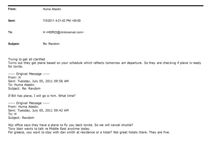 «Για την Ελλάδα θες να μείνεις στην κατοικία του Νταν Σμίθ (Αμερικανός Πρέσβης), ή σε ξενοδοχείο; Δεν έχουν εξαιρετικά ξενοδοχεία εκεί. Είναι καλά», είπε χαρακτηριστικά σε ένα e-mail της προς την Χίλαρι Κλίντον στις 5 Ιουλίου του 2011 προγραμματίζοντας την επίσκεψή της στην Ελλάδα, η Ούμα Αμπεντίν.