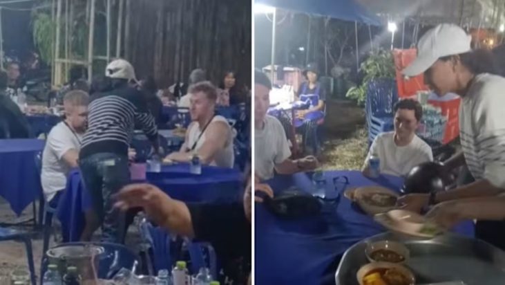 Στο βίντεο που τραβήχτηκε, και δημοσιεύει η Daily Mail, οι δύο Ευρωπαίοι φαίνονται να κάθονται σε τραπέζι, περιμένοντας να τους φέρουν το μενού, χωρίς να αντιλαμβάνονται ότι βρίσκονταν ανάμεσα σε πενθούντες.