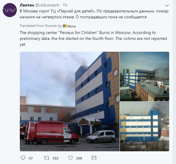 Η πυρκαγιά έχει τώρα κατασβεστεί, μετέδωσε το πρακτορείο ειδήσεων RIA, επικαλούμενο πηγή στις υπηρεσίες έκτακτης ανάγκης. Νωρίτερα ανέφερε πως η φωτιά είχε ξεσπάσει στο τετραώροφο εμπορικό κέντρο ‘Perseus for Childen’, το οποίο πουλά παιδικά προϊόντα.