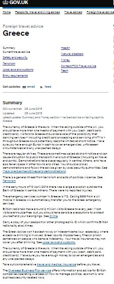 Ταξιδιωτική οδηγία προς τους Βρετανούς τουρίστες που  πρόκειται να ταξιδέψουν στην Ελλάδα, εξέδωσε το βρετανικό υπουργείο Εξωτερικών. Συγκεκριμένα ,τους συμβουλεύει να έχουν μαζί τους  αρκετά μετρητά καθώς ενδέχεται, όπως λέει, να υπάρξουν περιορισμοί στις τραπεζικές δραστηριότητες από την Δευτέρα.