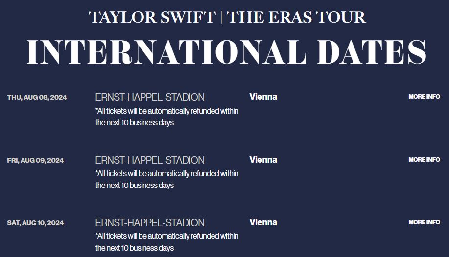 Όπως έγινε γνωστό το βράδυ της Τετάρτης, οι συναυλίες της Τέιλορ Σουίφτ στη Βιέννη ακυρώθηκαν από τους διοργανωτές καθώς οι Αυστριακές αρχές απέτρεψαν μια τρομοκρατική επίθεση που συνδέεται με το Ισλαμικό Κράτος. Η διάσημη ποπ σταρ θα έδινε τρεις συναυλίες στην Αυστρία, στο πλαίσιο της ευρωπαϊκής περιοδείας της «Eras Tour».