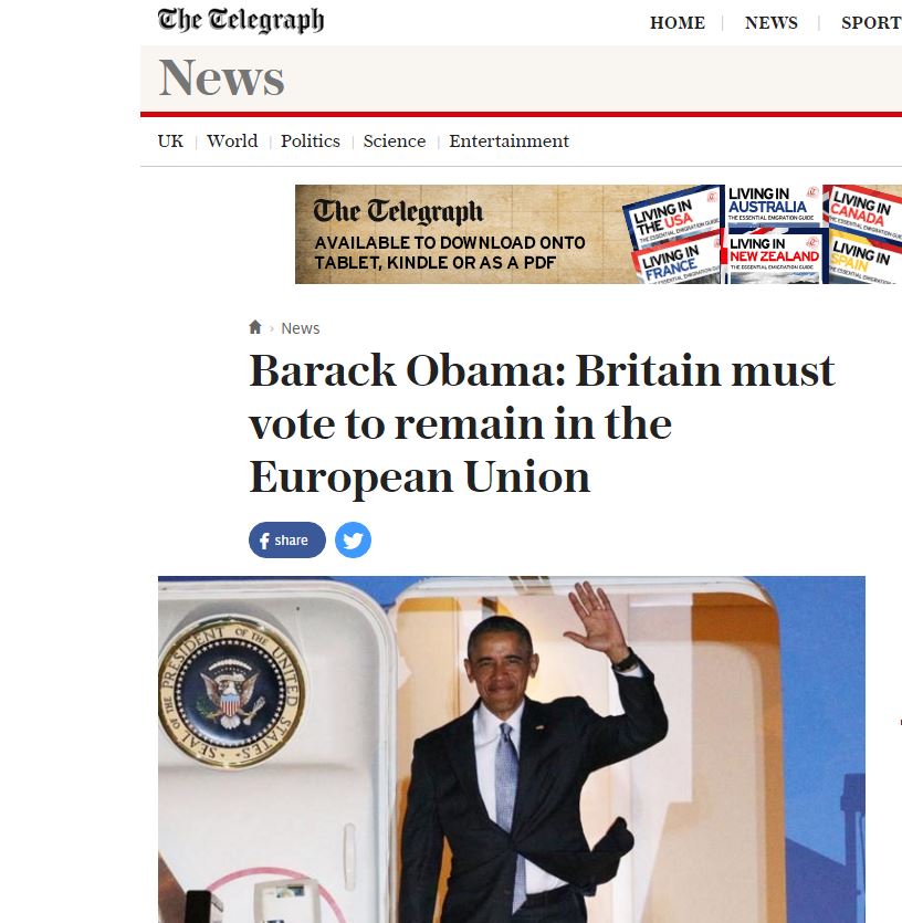 «Οι Βρετανοί πρέπει να ψηφίσουν υπέρ της παραμονής της χώρας τους στην Ευρωπαϊκή Ένωση», έγραψε χαρακτηριστικά ο Ομπάμα, ο οποίος, όμως, δεν έμεινε μόνο σ’ αυτά. Ο Αμερικανός πρόεδρος ισχυρίστηκε πως η θυσία των στρατιωτών της χώρας του κατά τη διάρκεια του Β’ Παγκοσμίου Πολέμου για το Ηνωμένο Βασίλειο σημαίνει πως «οι ΗΠΑ έχουν μερίδιο στη συζήτηση περί του δημοψηφίσματος», ενώ υπογράμμισε και το τι σημαίνει μία ψήφος για την αποχώρηση της χώρας από την Ε.Ε.