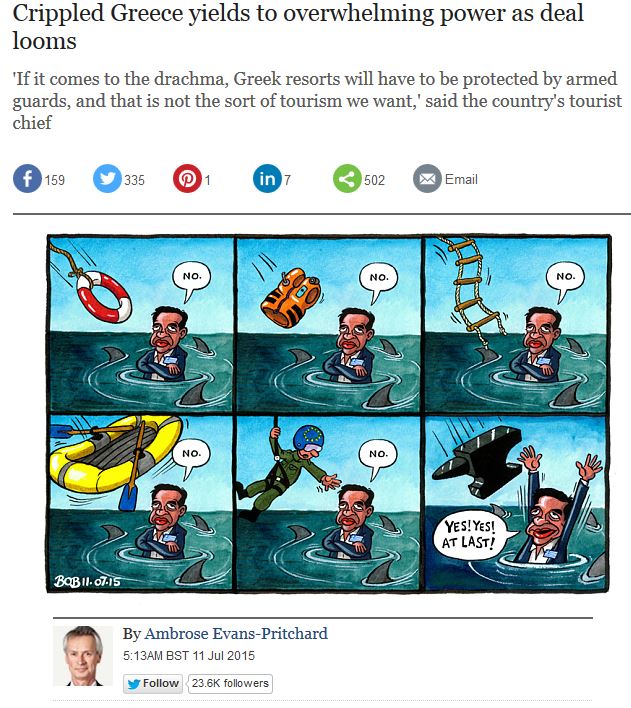 Η κυβέρνηση της Αριστεράς του ΣΥΡΙΖΑ στην Ελλάδα συμφώνησε σε δρακόντειους όρους λιτότητας τους οποίος απέρριψε ο ελληνικός λαός με ένα σαρωτικό «ΟΧΙ» στο δημοψήφισμα μόλις πριν από πέντε ημέρες, σε ένα από τα πιο περίεργα πολιτικά επεισόδια της σύγχρονης εποχής, αναφέρει το σχόλιο στη Telegraph.
