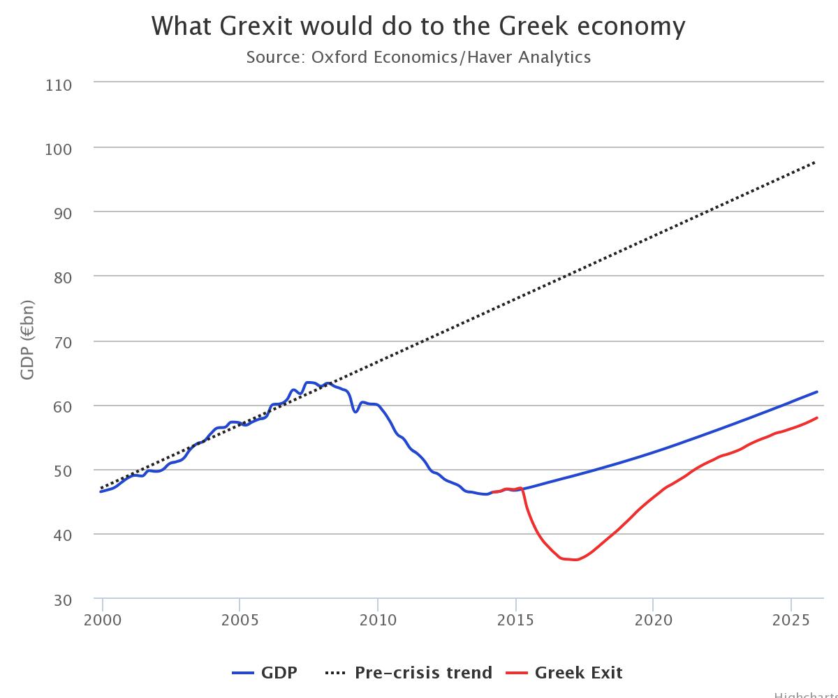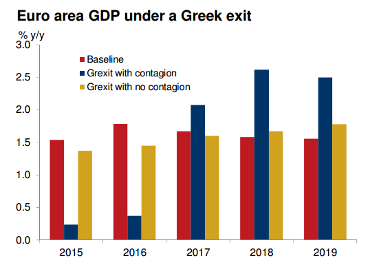 Ο μόνος αβέβαιος τομέας είναι ο χρηματοπιστωτικός. Ο Τζέιμς Νίξον και ο Μπεν Μέι της Oxford Economics σημειώνουν πως αν η Ελλάδα αποχωρήσει, αυτό θα συντρίψει την ψευδαίσθηση ότι η ένταξη στο ευρώ είναι αμετάκλητη. Έτσι οι αγορές θα αναγκαστούν να χρεώσουν ένα ασφάλιστρο κινδύνου για περιουσιακά στοιχεία που εκφράζονται στο ενιαίο νόμισμα. Αυτό δείχνει πως η οικονομική παραγωγή θα μπορούσε για τα επόμενα δύο χρόνια να δέχεται τις επιπτώσεις μιας μετάδοσης. Αυτό θα μείωνε το ΑΕΠ της Ευρωζώνης θα αντιμετώπιζε μια πτώση κοντά στο 2,2% σε σχέση με τα αναμενόμενα αποτέλεσμα στο 2016. Ο πανικός μπορεί να χτυπήσει τα πιο ευάλωτα μέλη της Ένωσης – ειδικά εκείνες που είναι υπερχρεωμένες. Θα αντιμετωπίσουν μεγαλύτερη συμπίεση, ενώ οι αποδόσεις των ομολόγων θα αρχίσουν να αναρριχώνται, σε ένα προσωρινό «νέο φυσιολογικό». Επίσης, θα μπορούσε να κλιμακωθεί η εκροή καταθέσεων, ενώ δεν θα αποκλειόταν το ακραίο ενδεχόμενο της επιβολής ελέγχου κεφαλαίων για να ανακοπούν οι απώλειες.