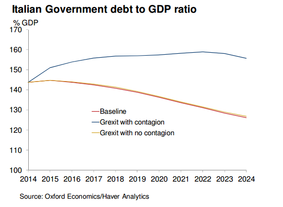 Η Telegraph κάνει μια προβολή στο δυσοίωνο μέλλον και εξετάζει και την περίπτωση που θα είναι η Ιταλία η επόμενη υποψήφια για έξοδο. Με χρέος στο 133% του ΑΕΠ, σε περίπτωση που έβγαινε από το ευρώ το χρέος θα ανέβαινε στο 145% μέχρι το 2024. Πάντως, αν η Ελλάδα αποχωρούσε το θέμα θα άνοιγε για όλες τις χώρες του Νότου που θα βρίσκονταν μπροστά σε ένα δίλημμα: μένουμε ή βγαίνουμε από το ευρώ;