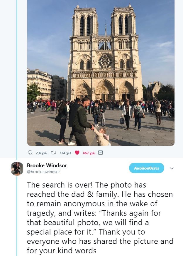 Χρειάστηκαν 223.660 retweets και 466.539 like για να λυθεί το μυστήριο με τη φωτογραφία που αποτύπωνε τις ανέμελες στιγμές ενός άνδρα με ένα κοριτσάκι με φόντο την Παναγία των Παρισίων, λίγο πριν ξεσπάσει η καταστροφική πυρκαγιά.Τη φωτογραφία τράβηξε η Brooke Windsor και η ίδια έγραψε στο Twitter πως «έβγαλα αυτή τη φωτογραφία την ώρα που φεύγαμε από την Παναγία των Παρισίων, περίπου μια ώρα πριν πιάσει φωτιά. Ήμουν έτοιμη να πάω στον μπαμπά να ρωτήσω εάν την ήθελε. Τώρα εύχομαι να το είχα κάνει. Twitter, αν έχεις μαγικές ικανότητες, σε παρακαλώ βοήθησέ τον να τη βρει».Από την πρώτη στιγμή η φωτογραφία χαρακτηρίστηκε ως «ιστορική» και στα social media ξεκίνησε ένας αγώνας για να εντοπιστούν ο άνδρας και το κοριτσάκι. Τελικά το μυστήριο λύθηκε το μεσημέρι της Πέμπτης με την Brooke Windsor να ενημερώνει πως βρέθηκαν οι «πρωταγωνιστές» της φωτογραφίας, ο πατέρας και η οικογένεια, προσθέτοντας πως θέλουν να διατηρήσουν την ανωνυμία τους.