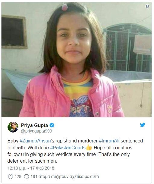 Ο 24χρονος Ιμράν Άλι, κρίθηκε ένοχος για τη δολοφονία της Ζαϊνάμπ Φατία Αμίν, το άψυχο κορμί της οποίας είχε βρεθεί στις αρχές Ιανουαρίου. Η μικρή Ζαϊνάμπ ήταν το δωδέκατο μικρό παιδί που δολοφονείται τα δύο τελευταία χρόνια σε ακτίνα 2 χιλιομέτρων γύρω από την πόλη Κάσουρ, γεγονός που ώθησε τις αρχές να εικάζουν ότι ένας κατά συρροή δολοφόνος δρούσε στην περιοχή. Ο Άλι, γενετικό υλικό του οποίου βρέθηκε τόσο στο σώμα της Ζαϊνάμπ όσο και σε άλλα έξι θύματα, ομολόγησε τελικά οκτώ ανθρωποκτονίες.