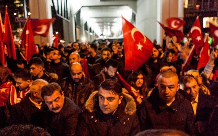Εκατοντάδες διαδηλωτές που κρατούσαν τουρκικές σημαίες συγκεντρώθηκαν έξω από το τουρκικό προξενείο του Ρότερνταμ ζητώντας να δουν την υπουργό Οικογενειακών Υποθέσεων της Τουρκίας, καθώς κλιμακώνεται η διπλωματική σύγκρουση μεταξύ της Ολλανδίας και της Τουρκίας.Με μεταλλικά φράγματα και έφιππους αστυνομικούς οι ολλανδικές δυνάμεις της τάξης προσπάθησαν να κρατήσουν μακριά από το προξενείο το πλήθος που μεγάλωνε, καθώς διαδηλωτές άρχισαν να φθάνουν από τη Γερμανία.Η υπουργός Οικογενειακών Υποθέσεων της Τουρκίας έφθασε οδικώς στην Ολλανδία από τη γειτονική Γερμανία, αφού η ολλανδική κυβέρνηση ανακοίνωσε ότι απαγορεύει στο αεροπλάνο που θα μετέφερε τον τούρκο υπουργό Εξωτερικών Μεβλούτ Τσαβούσογλου να προσγειωθεί στο Ρότερνταμ. Η ολλανδική αστυνομία την εμπόδισε να εισέλθει στο τουρκικό προξενείο της πόλης.Η ολλανδική κυβέρνηση κατέστησε σαφές ότι δεν θέλει Τούρκους πολιτικούς να κάνουν εκστρατεία για το δημοψήφισμα της 16ης Απριλίου στο ολλανδικό έδαφος στις κοινότητες των τούρκων μεταναστών.ΠΗΓΗ: ΑΠΕ – ΜΠΕ, ΠΗΓΗ ΦΩΤΟ: Anadolu