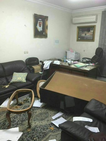Μια φωτογραφία στο Twitter δείχνει διαδηλωτές έξω από το κτίριο της πρεσβείας, με μικρές εστίες φωτιάς να καίγονται μέσα στο κτίριο, ενώ μια άλλη φωτογραφία δείχνει μια αίθουσα με σπασμένα έπιπλα, που φέρεται να είναι μέσα από το κτίριο.