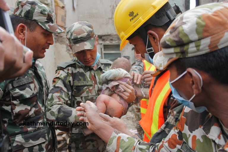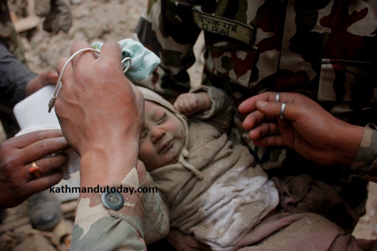 Τελευταία είδηση που έρχεται από την πληγείσα χώρα είναι οι φωτογραφίες που τράβηξε και έδωσε στη δημοσιότητα η νεπαλέζικη εφημερίδα «Kathmandutoday», στις οποίες απεικονίζεται η επιχείρηση διάσωσης του στρατού ενός μωρού 4 μηνών από τα συντρίμμια ενός κτιρίου. Το μωρό επέζησε 22 ολόκληρες ώρες στα ερείπια.