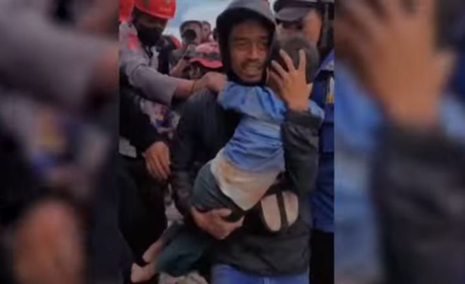 Μέλος σωστικού συνεργείου, χαμογελώντας πλατιά, παίρνει αγκαλιά το παιδί, που φοράει μπλουζάκι και μπλε παντελόνι, ενώ δεύτερο κρατάει το χέρι του αγοριού στο βίντεο, που δημοσιοποιήθηκε από την αυτοδιοίκηση στην Μπόγκορ, στη δυτική Ιάβα.