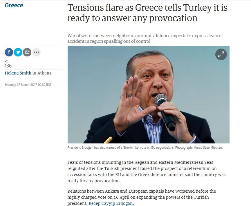 Ο «πόλεμος» δηλώσεων μεταξύ Ελλάδας και Τουρκίας κάνει τους αναλυτές στα θέματα εθνικής άμυνας να θεωρούν ότι ο κίνδυνος ενός ατυχήματος στο Αιγαίο είναι μεγάλος, όπως αναφέρει σε δημοσίευμα του ο Guardian.Σύμφωνα με το βρετανικό δημοσίευμα, αυξάνονται οι φόβοι για ένταση στο Αιγαίο και την ανατολική Μεσόγειο μετά τις δηλώσεις του Τούρκου Προέδρου για ενδεχόμενη διενέργεια δημοψηφίσματος αναφορικά με τις συζητήσεις για την ένταξη της χώρας στην ΕΕ και τις αναφορές του Έλληνα υπουργού Εθνικής Άμυνας ότι η χώρα είναι έτοιμη για οποιαδήποτε πρόκληση.Η διαμάχη εντάθηκε την περασμένη εβδομάδα, σημειώνει ο Guardian, όταν ο Ρετζέπ Ταγίπ Ερντογάν ανέφερε ότι θα συνεχίσει να αποκαλεί τους Ευρωπαίους πολιτικούς «ναζί» εάν εκείνοι συνεχίσουν να τον χαρακτηρίζουν ως «δικτάτορα», δηλώσεις που όπως επισημαίνει το δημοσίευμα, έγιναν λίγες ώρες μετά το σχόλιο του Πάνου Καμμένου κατά τη διάρκεια της στρατιωτικής παρέλασης ότι οι ένοπλες δυνάμεις είναι έτοιμες να απαντήσουν, εάν απειληθεί η εδαφική ακεραιότητα της χώρας.«Οι ελληνικές Ένοπλες Δυνάμεις είναι έτοιμες να απαντήσουν σε κάθε είδους πρόκληση. Είμαστε έτοιμοι, γιατί έτσι υπερασπιζόμαστε την ειρήνη» δήλωσε ο κ. Καμμένος.Παρότι είναι σύμμαχοι στο ΝΑΤΟ, οι δύο γείτονες συγκρούστηκαν για το ζήτημα της Κύπρου το 1974 και για το περιστατικό στα Ίμια το 1996, αναφέρει η βρετανική εφημερίδα, που επικαλείται επίσης δηλώσεις του Νίκου Αναστασιάδη ο οποίος εξέφρασε τον φόβο για «θερμό επεισόδιο» από την πλευρά της Τουρκίας με αφορμή το επερχόμενο δημοψήφισμα.Σημειώνει, δε, ότι η ασταθής συμφωνία που έχει υπογράψει η Τουρκία με την Ευρωπαϊκή Ένωση αναφορικά με το προσφυγικό έχει εντείνει την πίεση.«Η ανησυχία της ελληνικής πλευράς δεν έγκειται τόσο για ένα εκ προθέσεως περιστατικό, αλλά για ένα ατύχημα που θα βγάλει την κατάσταση εκτός ελέγχου», δήλωσε στον Guardian ο καθηγητής Θάνος Ντόκος, από το ΕΛΙΑΜΕΠ.Με τη ρητορική που έχει υιοθετήσει η τουρκική πλευρά το τελευταίο διάστημα, υποστηρίζει το βρετανικό δημοσίευμα, Έλληνες αξιωματούχοι ανησυχούν ότι ενδεχόμενη περαιτέρω απομάκρυνση της Τουρκίας από την Ευρώπη θα σημάνει καταστροφή, εάν προκύψει μία κρίση.Η δήλωση του Προέδρου των ΗΠΑ Ντόναλντ Τραμπ ότι «αγαπάει τους Έλληνες» στην επέτειο της 25ης Μαρτίου, δεν έχει μειώσει τους φόβους κατά πόσο σε ενδεχόμενο χάος, η Αθήνα θα μπορούσε να στηριχτεί στην Ουάσινγκτον.«Η Ελλάδα έχει εκφράσει τις ανησυχίες της στις ΗΠΑ», ανέφερε ο κ. Ντόκος, προσθέτοντας ότι εάν οι ΗΠΑ δεν μπορέσουν να παίξουν τον ρόλο του «πυροσβέστη», από τη στιγμή που η επιρροή του ΝΑΤΟ και της ΕΕ είναι ακόμη μικρότερη, «τότε το μεγάλο ερώτημα παραμένει για το ποιος θα μπορούσε να διαχειριστεί μία τέτοια κρίση, εάν αυτή συνέβαινε».
