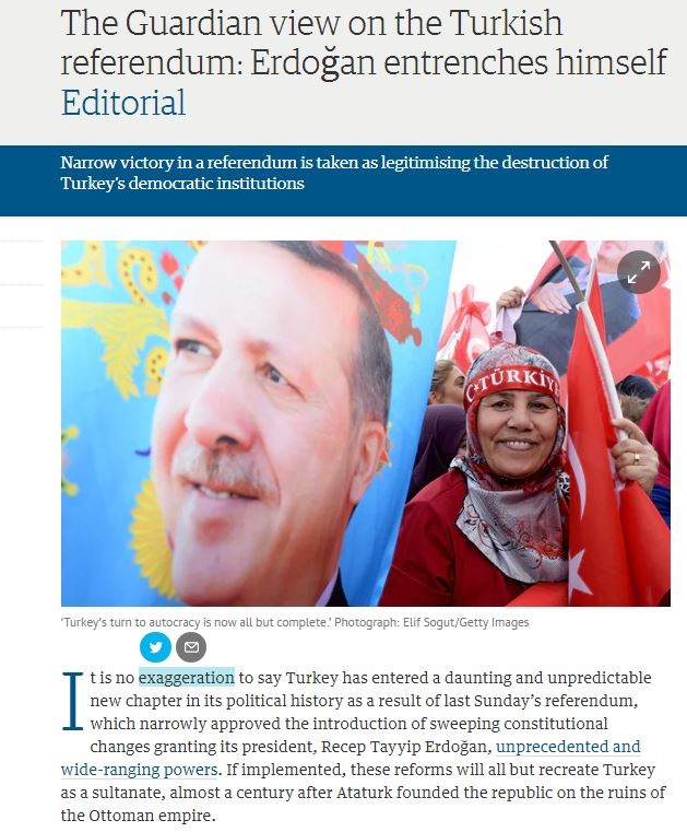 «Δεν είναι υπερβολή να πούμε ότι η Τουρκία έχει εισέλθει σε ένα τρομακτικό και απρόσμενο νέο κεφάλαιο στην πολιτική ιστορία της» αναφέρει ο Guardian που αναλύει το αποτέλεσμα του δημοψηφίσματος της Κυριακής δίνονται στον Πρόεδρο Ρετζέπ Ταγίπ Ερντογάν «πρωτοφανείς και διευρυμένες εξουσίες».Σύμφωνα με βρετανικό δημοσίευμα «αν υλοποιηθούν αυτές οι μεταρρυθμίσεις δεν θα αναδημιουργήσουν παρά ένα σουλτανάτο, σχεδόν έναν αιώνα αφού ο Ατατούρκ ίδρυσε τη δημοκρατία στα ερείπια της οθωμανικής αυτοκρατορίας».«Για την Ευρώπη, καθώς και για τους δυτικούς συμμάχους της Τουρκίας στο ΝΑΤΟ, ο μετασχηματισμός είναι πιθανό να έχει σημαντικές συνέπειες. Οι σχέσεις, ήδη τεταμένες, είναι βέβαιο ότι θα επιδεινωθούν περαιτέρω, σε μία στιγμή που η συνεργασία της Τουρκίας στο προσφυγικό ζήτημα συγκεκριμένα εξακολουθεί να είναι κρίσιμη», τονίζει ο Guardian και συνεχίζει αναφερόμενος στην «επιφυλακτική» αντίδραση των Βρυξελλών, του Βερολίνου και του Παρισιού μαρτυρεί αυτή τη νέα δυσφορία. Όπως υπενθυμίζει, ο Ερντογάν είχε ήδη προειδοποιηθεί ότι αν εκπληρώσει την απειλή του και επαναφέρει τη θανατική ποινή, θα τερματίσει αμέσως κάθε προοπτική προσέγγισης με την ΕΕ.Σύμφωνα με το δημοσίευμα ούτε η μικρή διαφορά με τη οποία επικράτησε το «ναι» στο δημοψήφισμα ούτε οι κατηγορίες της αντιπολίτευσης για παραβιάσεις στη διαδικασία, αλλά και οι έκθεση κόλαφος των διεθνών παρατηρητών, δεν εμπόδισε τον Τούρκο Πρόεδρο και τους υποστηρικτές του κόμματός του (ΑΚP) να προαναγγείλει αυτό που βλέπει ως μία νέα εποχή που προορίζεται να εδραιώσει τη δύναμη ενός ανθρώπου όπως και τη δύναμη και την αντοχή ενός έθνους στην αντιμετώπιση των εξωτερικών και εγχώριων εχθρών».«Το δημοκρατικό σύστημα ελέγχων και ισορροπιών πρόκειται να συνθλιβεί. Ωστόσο, παραμένει μία βαθιά διχασμένη χώρα, στην οποία η σύγκρουση ανάμεσα σε εκείνους που υποστηρίζουν την κληρονομιά του Ατατούρκ και αυτούς που θέλουν να την ανατρέψουν, ανάμεσα στους υποστηρικτές ενός κοσμικού συστήματος και τους υποστηρικτές των συντηρητικών ισλαμικών αξιών, ανάμεσα στους Κούρδους και Τούρκους εθνικιστές, ανάμεσα στο κάποτε κυρίαρχες στρατιωτικές δομές και τις νέες ελίτ του AKP, αναμένεται να τροφοδοτήσει ακόμα περισσότερες εντάσεις», σημειώνει ο Guardian.Παράλληλα η βρετανική εφημερίδα σχολιάζοντας τις συνθήκες που διεξήχθη το δημοψήφισμα «εν μέσω μίας πολιτικής καταστολής που έφτασε σε «θεαματικά επίπεδα» μετά το αποτυχημένο πραξικόπημα του περασμένου χρόνου, τονίζει ότι ο «ισχυρός άνδρας της Τουρκίας έχει πολώσει εσκεμμένα τη χώρα του, σπέρνοντας τον τρόμο μέσω μίας ευρείας κλίμακας εκκαθαρίσεων και καταδίωξης των αντιφρονούντων, και έχει ρίξει τις στρατιωτικές του δυνάμεις σε πλήρη πόλεμο ενάντια στις κουρδικές αυτονομιστικές ομάδες, και πιο πρόσφατα προωθώντας πολλαπλές κρίσεις με τις ευρωπαϊκές κυβερνήσεις».«Η πολιτική διολίσθηση της Τουρκίας είναι τόσο βαρυσήμαντη όσο δύσκολο ήταν να προβλεφθεί στα πρώτα χρόνια του ΑΚP, της πρώτης ισλαμιστικής κυβέρνησης. Οι δημοκρατικές και οικονομικές μεταρρυθμίσεις χειροκροτήθηκαν από τη Δύση. Σύντομα η ΕΕ ήταν έτοιμη να ξεκινήσει δειλά τις ενταξιακές διαπραγματεύσεις. Μετά την πολιτική αστάθεια και διαφθορά του 1990, αυτή ήταν μία νέα Τουρκία που η ισλαμιστική της ηγεσία φάνηκε όχι περισσότερο ριζοσπαστική θρησκευτικά από τους Χριστιανοδημοκράτες της Ευ