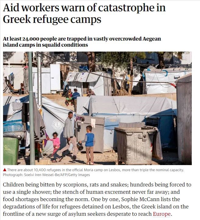 Η Sophie McCann από τους Γιατρούς Χωρίς Σύνορα μιλώντας στη βρετανική εφημερίδα αναφέρει ότι “τουλάχιστον 24.000 άνδρες, γυναίκες και παιδιά είναι παγιδευμένοι στα υπερπλήρη κέντρα φιλοξενίας των νησιών του Αιγαίου και ζουν σε συνθήκες που πλησιάζουν τα όρια της ανθρωπιστικής καταστροφής. Τέσσερα χρόνια μετά την μεγαλύτερη μεταναστευτική κρίση της σύγχρονης ιστορίας, υπάρχουν φόβοι ότι η ιστορία επαναλαμβάνεται. Το επίπεδο του ‘πόνου’ που βιώνουν αυτοί οι άνθρωποι δεν περιγράφεται” και προσθέτει: