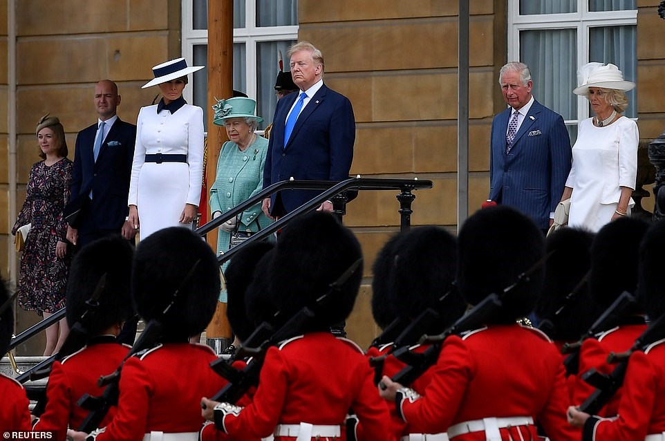 Η βασίλισσα και ο πρόεδρος βγήκαν και πάλι μπροστά στο Ανάκτορο για την ανάκρουση του αμερικανικού εθνικού ύμνου από τη βασιλική φρουρά, πριν ο Τραμπ επιθεωρήσει το άγημα.