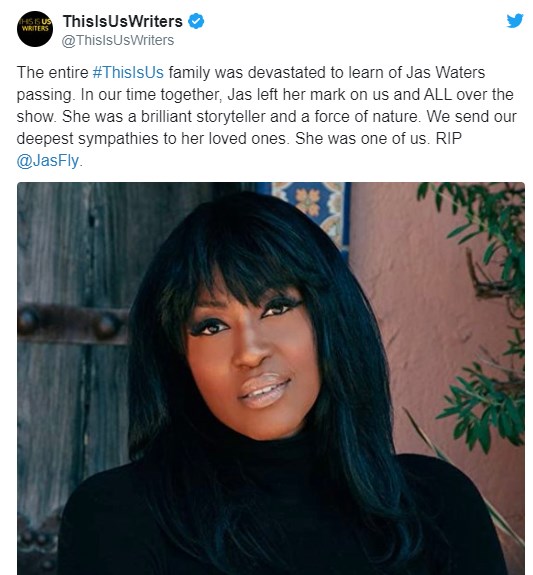 “Όλοι οι συντελεστές της οικογένειας του #ThisIsUs είμαστε συντετριμμένοι για την απώλεια της Jas Waters passing. Στις στιγμές που μοιραστήκαμε η Jas άφησε το σημάδι της σε όλους μας και σε όλη τη σειρά. Ήταν μια καταπληκτική αφηγήτρια ιστοριών και μια δύναμη της φύσης. Στέλνουμε τα συλλυπητήριά μας στα αγαπημένα της πρόσωπα” αναφέρει η ανακοίνωση.