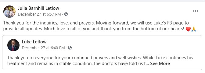 Σε μια ανάρτηση στο Facebook την Κυριακή, η σύζυγος του Letlow Julia ευχαρίστησε το κοινό για τις «συνεχιζόμενες προσευχές και ευχές» καθώς ο σύζυγός της συνέχιζε τότε να καταπολεμά την ασθένεια. «Σας ευχαριστούμε όλους από το βάθος της καρδιάς μας για την έκρηξη της υποστήριξης που λάβαμε και αισθανόμαστε πραγματικά ευλογημένοι που αγγίξαμε τις προσευχές τόσων πολλών», έγραψε.
