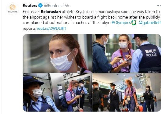 Έκκληση για βοήθεια απηύθυνε η Λευκορωσίδα σπρίντερ, Κριστσίνα Τσιμανούσκαγια, προς τη Διεθνή Ολυμπιακή Επιτροπή, ζητώντας την παρέμβασή της, καθώς, όπως υποστήριξε, απομακρύνθηκε από την Εθνική ομάδα και οδηγήθηκε στο αεροδρόμιο του Τόκιο ενάντια στις επιθυμίες της.