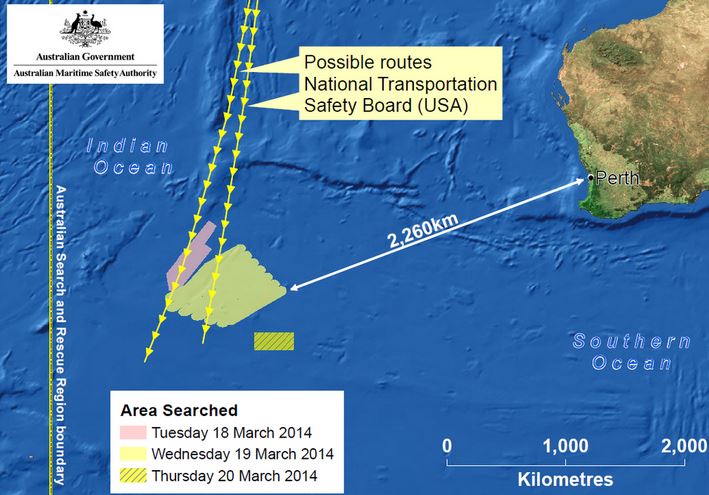 Η κυβέρνηση της Αυστραλίας έχει στείλει ένα αεροσκάφος στην περιοχή περίπου 3000 χιλιόμετρα δυτικά του Περθ στον Ινδικό Ωκεανό ενώ αναμένονται άλλα τρία αεροπλάνα για να ερευνήσουν και πιθανώς να ανασύρουν δυο αντικείμενα που εντοπίστηκαν μέσω δορυφόρου να επιπλέουν στο νότιο Ινδικό Ωκεανό.