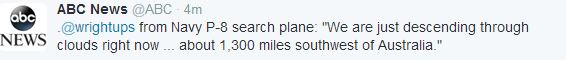 Όπως αναφέρει το abc το ερευνητικό αεροσκάφος της Αυστραλίας θα φτάσει σε περίπου τρεις ώρες στο σημείο, όπου οι δορυφόροι εντόπισαν τα αντικείμενα που μπορεί να ανήκουν στο εξαφανισμένο αεροσκάφος.