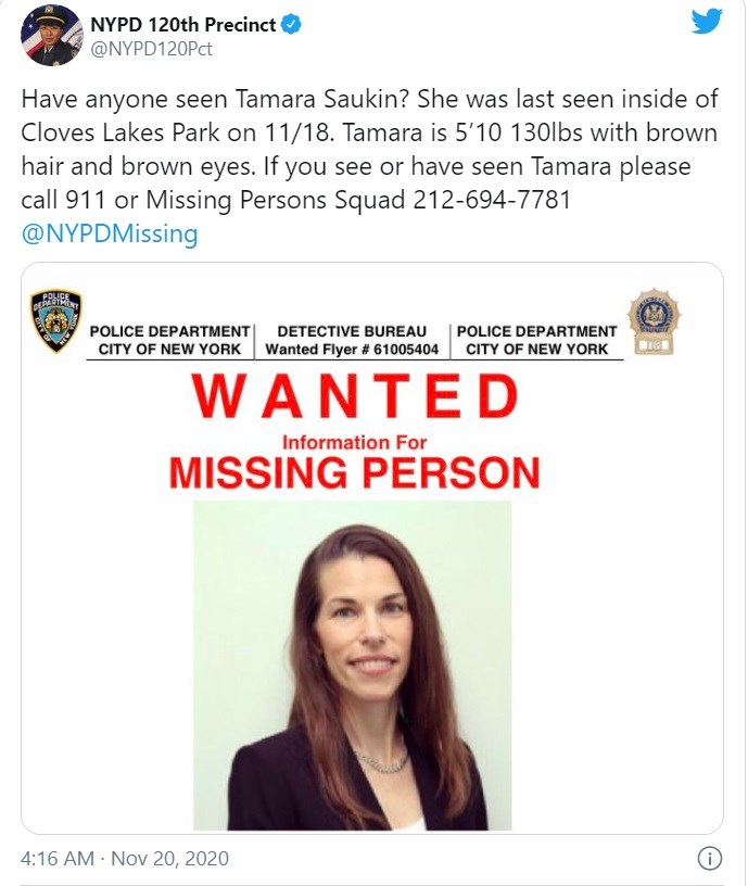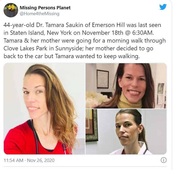 Έπειτα από εβδομάδες αναζήτησης η αστυνομία της Νέας Υόρκης θεωρεί ότι βρήκε το πτώμα της 44χρονης Ταμάρα Σάουκιν η οποία αγνοείτο από τις 18 Νοεμβρίου. Η γιατρός είχε πάει για περπάτημα μαζί με τη μητέρα της σε πάρκο του Στέιτεν Άιλαντ, κάτι που ήταν η καθημερινή ρουτίνα τους. Όταν η άλλη γυναίκα κουράστηκε, η γιατρός είπε ότι θα συνεχίσει, με τη μητέρα της να επιστρέφει στο αυτοκίνητο για να την περιμένει. Έκτοτε η Ταμάρα αγνοείτο. Οι αστυνομικοί βρήκαν το πτώμα της γυναίκας να επιπλέει στη λίμνη του πάρκου την Τετάρτη το πρωί. Μέχρι τώρα δεν υπάρχουν ενδείξεις εγκληματικής ενέργειας. Η γιατρός είχε ιστορικό σε αυτοκτονικές τάσεις και αλκοολισμό, σύμφωνα τα όργανα επιβολής του νόμου. Πρόσφατα είχε αλλάξει την προσωπική της κατάσταση σε “αυταπασχολούμενη” ενώ είχε πει ότι αντιμετώπιζε οικογενειακά ζητήματα.