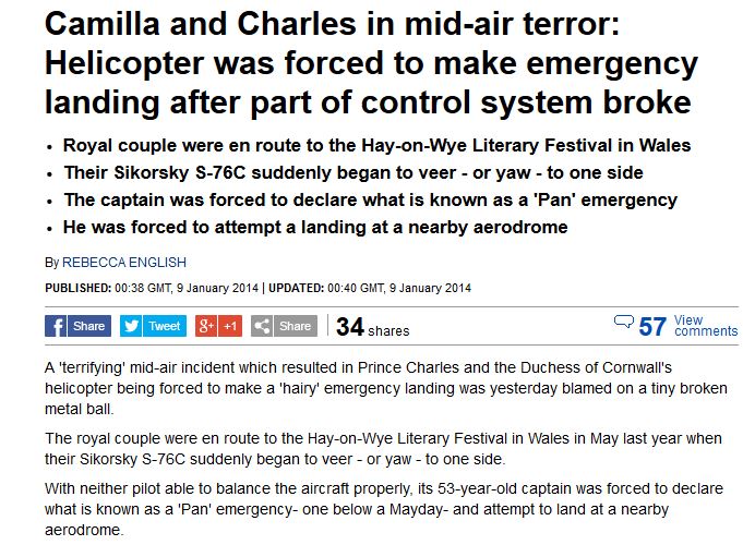 Ο πρίγκιπας Κάρολος και η Καμίλα επέλεξαν ένα ελικόπτερο για να μεταβούν στο λογοτεχνικό φεστιβάλ στην Ουαλία. Ωστόσο, στη διάρκεια της πτήσης το ελικόπτερο άρχισε να γέρνει προς τη μία πλευρά.