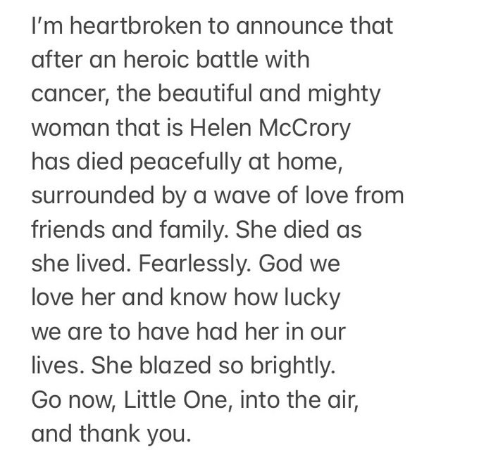 Σύμφωνα με την ανάρτησή του η ηθοποιός πέθανε στο σπίτι της πλημμυρισμένη από κύμα αγάπης από φίλους και οικογένεια. “Πέθανε όπως έζησε. Ατρόμητα” γράφει μεταξύ άλλων.