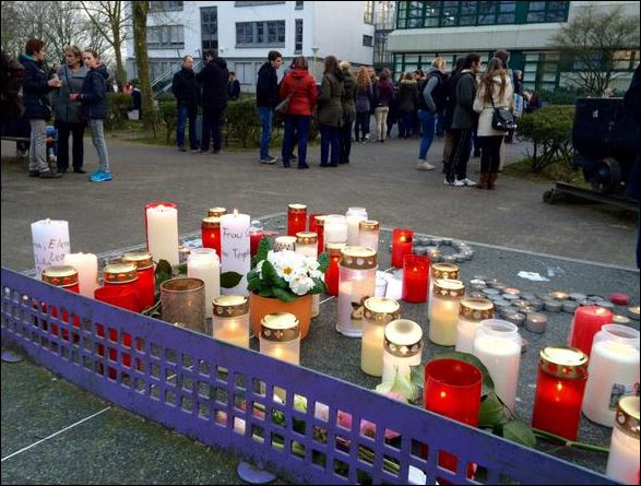 Πολίτες της πόλης Χάλτερν αμ Ζε, στη Γερμανία, φθάνουν στο σχολείο Joseph-Koenig όπου φοιτούσαν οι 16 μαθητές που επέβαιναν στο μοιραίο Airbus, που συνετρίβη στις γαλλικές Άλπεις.