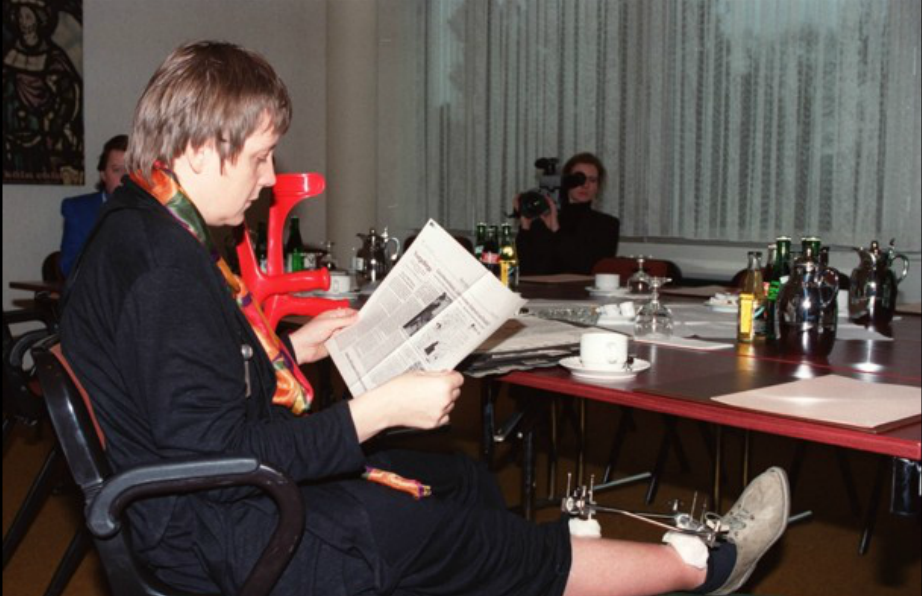 3 Φεβρουαρίου 1992.Η Άνγκελα Μέρκελ, ως υπουργός Γυναικείων Θεμάτων και Νεολαίας, κατά τη διάρκεια συνάντησης του Χριστιανοδημοκρατικού κόμματος στη Βόννη. Στη συνάντηση η καγκελάριος της Γερμανίας, είχε φτάσει με πατερίτσες, καθώς είχε σπάσει το πόδι της τρεις εβδομάδες νωρίτερα.