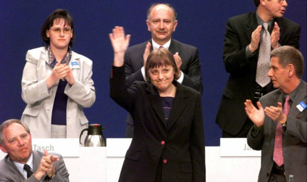 10 Απριλίου 2000 Ως γενική γραμματέας του κομμάτος η Άνγκελα Μέρκελ χαιρετάει το κοινό μετά το τέλος της ομιλίας της σε συνέδριο των Χριστιανοδημοκρατών στο Έσσεν της Γερμανίας. Δίπλα της ο υπουργός Οικονομικών της Γερμανίας, Βόλφγκανγκ Σόιμπλε, επίσης, αρκετά νεότερος.