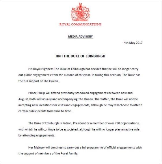 Όπως αναφέρεται στην ανακοίνωση, ο πρίγκιπας Φίλιππος και Δούκας του Εδιμβούργου αποσύρεται από τα βασιλικά του καθήκοντα, καθώς από το φθινόπωρο δεν θα ασκεί πλέον τις βασιλικές του υποχρεώσεις.