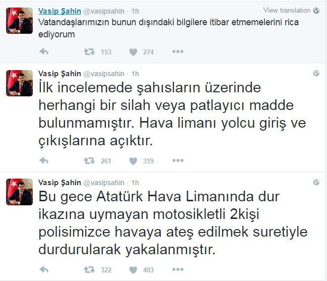 Τρία tweets στον επίσημο λογαριασμό στο Twitter έκανε πριν από λίγο ο κυβερνήτης της Κωνσταντινούπολης, Βασίπ Σαχίν για το τι ακριβώς συνέβη λίγο μετά τα μεσάνυχτα στο αεροδρόμιο «Ατατούρκ».