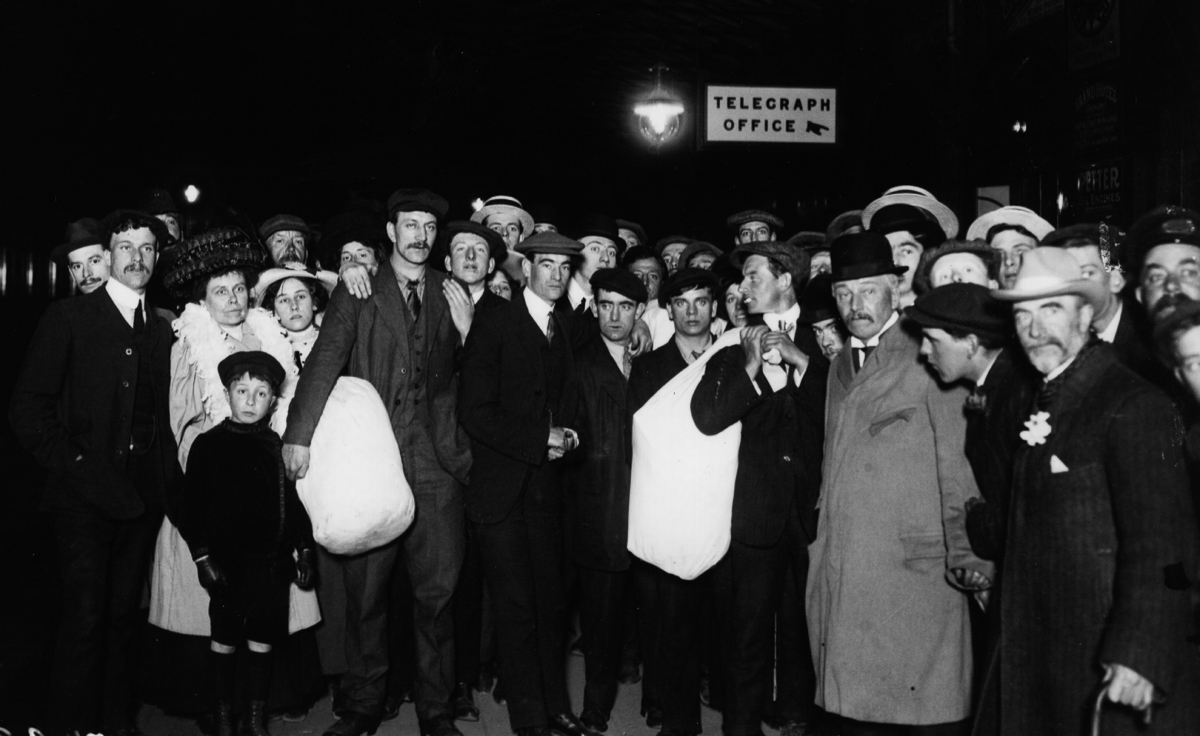 Άνθρωποι περιμένουν προκειμένου να μάθουν τα νέα έξω από τα γραφεία της ναυτιλιακής εταιρείας, White Star Line στη Νέα Υόρκη.