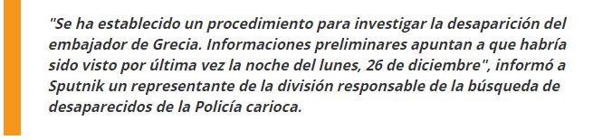 Σε εξέλιξη βρίσκεται επιχείρηση ανεύρεσης του Έλληνα πρέσβη στη Βραζιλία, Κυριάκου Αμοιρίδη βάσει των όσων δήλωσε εκπρόσωπος της αστυνομίας στην ισπανόφωνη έκδοση του Sputnik.