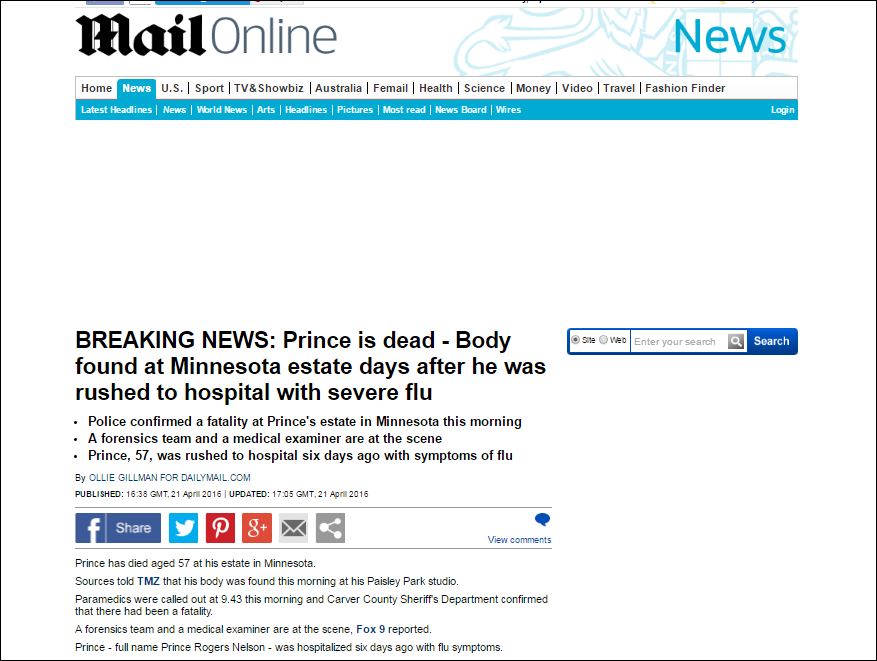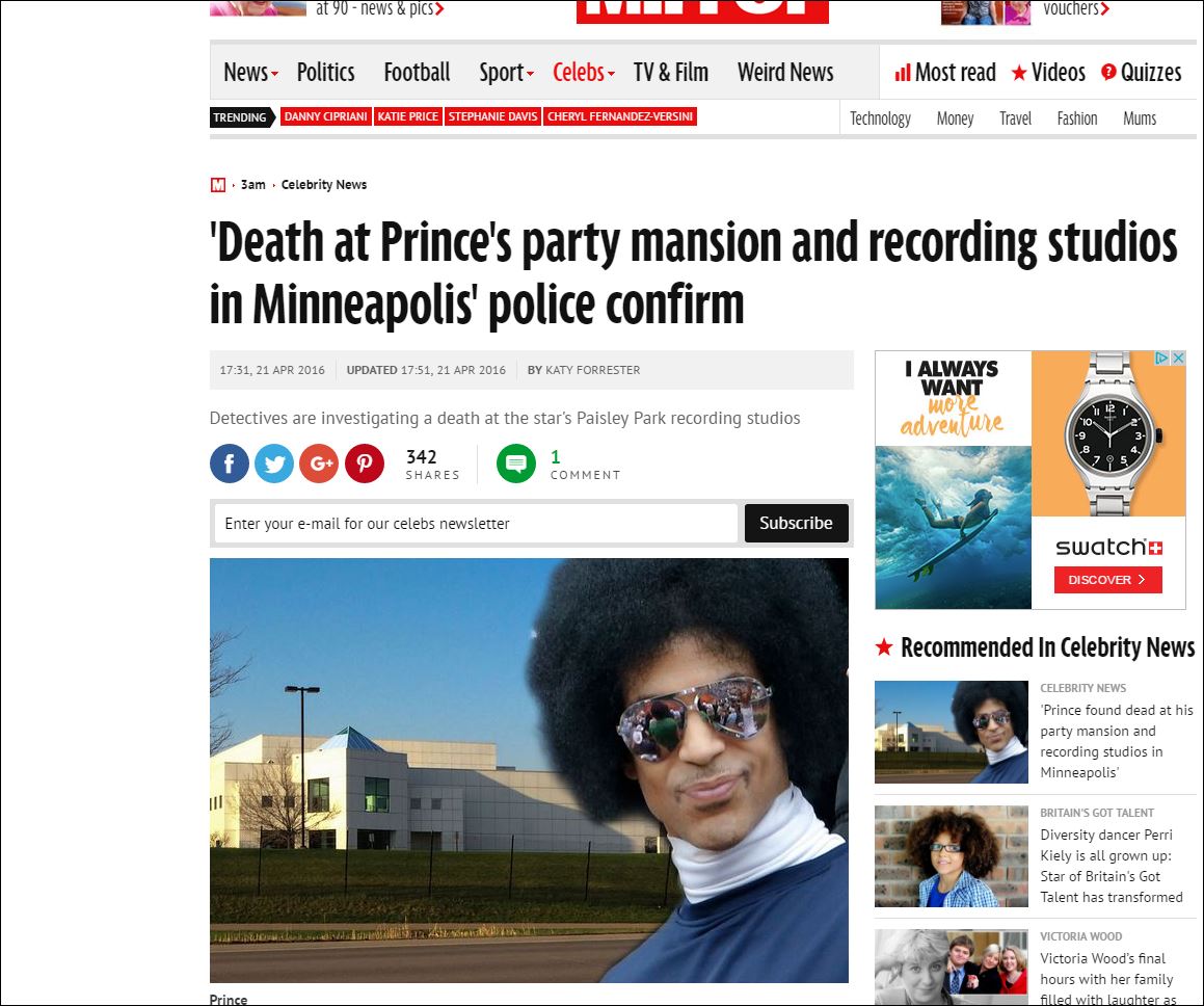 “Ο Prince είναι νεκρός- Η σορός του βρέθηκε σε έπαυλη στην Μινεσότα. Νοσηλευόταν επί έξι μέρες στο νοσοκομείο, εξαιτίας μιας σοβαρής γρίπης”, γράφει στο πρωτοσέλιδό της, η Daily Mail.