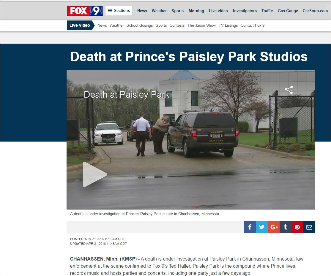 “Ένας νεκρός στο συγκρότημα «Paisley» του Prince. Αυτή τη στιγμή, ένας θάνατος διερευνάται στη Μινεσότα”, αναφέρει το Fox 9,
